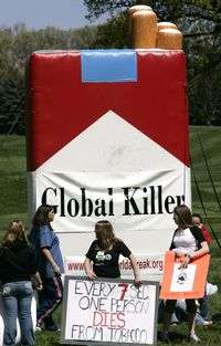 "Cada siete segundos muere una persona a causa del tabaco" y "Asesino mundial", rezan letreros desplegados por activistas del no fumar, ayer en Hanover, Nueva Jersey, cerca de la reunión anual del grupo Altria, casa matriz de la tabacalera Phillip Morris