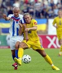 Andriy Voronin, de Ucrania (derecha), protege el balón ante el acoso del costarricense Danny Fonteseca