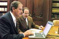 El presidente Vicente Fox, durante la presentación vía Internet de su declaración patrimonial, acompañado por el secretario de la Función Pública, Eduardo Romero Ramos, desde la biblioteca José Vasconcelos de la residencia oficial de Los Pinos
