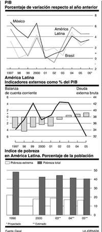 En 2004 las economías de América Latina crecieron a una tasa promedio de 5.9%, la más alta desde 1981, al mismo tiempo que salían, por fin, de varios años de estancamiento (o algo peor en algunas naciones). Aunque el ritmo ha sido un poco lento, el crecimiento no se ha detenido (ver gráfica 1). La Comisión Económica para América Latina y el Caribe (Cepal) espera un crecimiento de 4.6% para este año, pero esta estimación podría ser superada. El banco de inversión Barclays Capital considera que en los primeros tres meses de este año la región creció a una tasa anual de 6%.