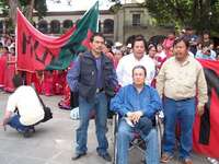 Humberto Pazos Ortiz (en silla de ruedas), dirigente del Movimiento Unificador de Lucha Triqui, al frente de los manifestantes que exigieron parar la violencia