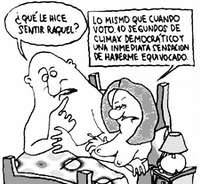 El bloguero Un Gerente decidió ilustrar sus temores con un cartón del humorista argentino Bianfa. Lo expresó así: "Ya tenemos re-presidente, se reeligió, contundentemente en las cifras, eso quiere decir que la mayoría de los que votamos lo hicimos por Alvaro Uribe Vélez, el actual presidente. . . Desafortunadamente, fuimos como 12 millones de votos contra más de 26 millones que podían hacerlo. . . je je je. . . eso quiere decir que yo decidí por '2 y pico' de pendejos perezosos, que critican y nada más. . . espero que no me pase lo que le pasa a ella..."