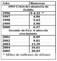 El éxito del plan para crear empleos de don Vicente Fox se refleja en el crecimiento de los envíos de dinero de nuestros paisanos; tiene relación directamente proporcional con las crisis económicas de México. Podría establecerse esta ecuación: más crisis igual a más remesas. El cuadro que aparece en esta página, elaborado con datos del Banco de México, muestra cómo fue después de la devaluación zedillista (1994-95), que comenzaron a aumentar. Pero han llegado a su punto máximo a lo largo de los maravillosos años recientes.