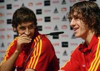 Los españoles Raúl y Carles Puyol, durante la conferencia de prensa tras una práctica del equipo