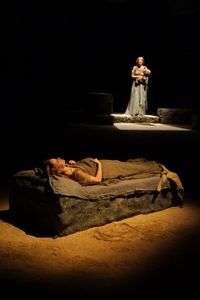 Adentro del Teatro Juan Ruiz de Alarcón, en el escenario, ha sido construido un teatro griego, con columnas, graderío circular y, dentro de éste, otro escenario con piso de arena, también circular. A un costado, ocultando el área de las butacas, que ahora no son ocupadas, se colocó una pantalla gigante que se llena con tomas de líquido rojo, como la sangre.