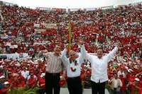 El senador Enrique Jacson, el candidato de la Alianza PRI-PVEM a la gubernatura de Chiapas y el dirigente nacional priísta, Mariano Palacio Alcocer, en el acto de inicio de campaña efectuado en Tapachula