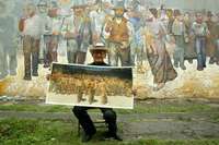 El pintor Daniel Manrique, en el mural La marcha de los de a de veras, rescata la importancia del trabajador porque "cultura es saber que nuestras manos son para elaborar lo que es estrictamente necesario para vivir".
