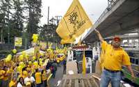 San Salvador Atenco, Mex., 4 de junio. Al grito de "¡A un mes de la represión, seguimos en pie!", habitantes de este municipio y simpatizantes del Frente de Pueblos en Defensa de la Tierra (FPDT) marcharon este domingo por la carretera federal Texcoco-Lechería para exigir al gobierno un alto a la represión.