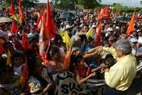 Andrés Manuel López Obrador, abanderado de la coalición Por el Bien de Todos a la Presidencia de la República, durante su mitin en Peto, Yucatán