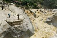 Habitantes de Huixtla trasladan víveres mediante un lazo con polea sobre el río Huixtla, luego que las aguas del afluente destruyeron el puente de madera provisional el jueves pasado