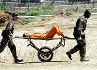 Imagen de febrero de 2002, de un prisionero en Guantánamo trasladado por soldados estadunidenses a una celda especial para interrogatorios