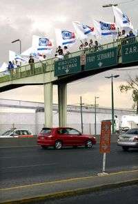 Panistas ondean banderas afuera de las instalaciones de la empresa MVS, antes del debate