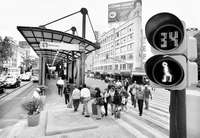 Funcionamiento de uno de los semáforos peatonales instalados a lo largo de la ruta del Metrobús. La imagen corresponde al cruce de las avenidas Insurgentes y Reforma