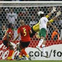 El arquero Joao Ricardo se lanza ante el remate de cabeza de Rafael Márquez; Akwa (izquierda) y Kali perdieron la marca del defensa del Barcelona