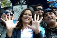 Vestida de jeans, chamarra y tines marca Calderón, la diputada con licencia acudió en representación del candidato presidencial a una carrera atlética, donde el PAN premió con bicicletas de montaña, televisores, reproductores de dvd, juegos Xbox y medallas a los ganadores.