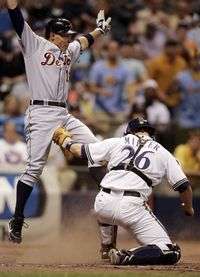 Damian Miller (26) de los cerveceros de Milwaukee toca a Brandon, de los tigres de Detroit, para cerrar la cuenta del corredor, en su octavo turno del juego