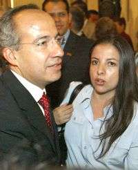 La reportera Claudia Herrera y el abanderado panista a la Presidencia de la República, Felipe Calderón, luego de que éste dio a conocer un documento sobre acciones de gobierno