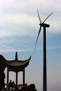 Una pareja está sentada frente a un molino de viento usado como fuente de energía en Feng Xian, en Shanghai