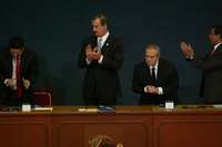 Ampliar la imagen Ayer el presidente Vicente Fox encabezó la presentación del Sistema Logístico para el Desarrollo Productivo en el Istmo al sector privado, en la residencia oficial de Los Pinos. Lo acompañan los gobernadores de Oaxaca, Ulises Ruiz, y de Veracruz, Fidel Herrera, así como el secretario de Comunicaciones Pedro Cerisola Foto: José Antonio López