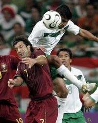 Dura lucha por el balón entre Luis Figo y el mexicano Carlos Salcido
