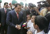 Durante su visita a Panamá el presidente venezolano Hugo Chávez platica con algunos ñiños acompañado de su anfitrión, el mandatario Martín Torrijos. Chávez promueve su proyecto energético en el que busca la participación de Panamá para la construcción de una refinería