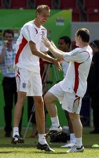 Buen ambiente durante la sesión de entrenamiento de la escuadra británica. En la imagen, Wayne Rooney, a la derecha, y Peter Crouch