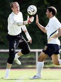 Los seleccionados australianos Mark Schwarzer y John Aloisi durante una sesión de entrenamiento en Oehringen