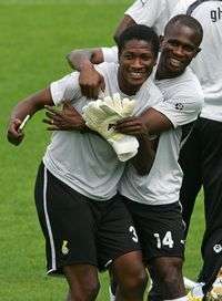 Los ghaneses Asamoah Gyan y Matthew Amoah se divierten en una práctica realizada el sábado en el estadio Dallenberg, en Wurzburg