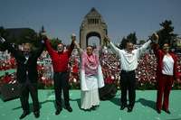 La aspirante de la alianza Unidos por la Ciudad, Beatriz Paredes Rangel (segunda de izquierda a derecha), cerró ayer su campaña en la explanada del Monumento a la Revolución, conjuntamente con el candidato presidencial Roberto Madrazo Pintado. Los acompañaron los dirigentes nacional y local del PRI, Mariano Palacios y María de los Angeles Moreno