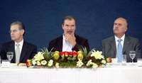 Ampliar la imagen Luis Ernesto Derbez, secretario de Relaciones Exteriores; el presidente Vicente Fox, y José Luis Barraza González, presidente del Consejo Coordinador Empresarial, durante el desayuno de clausura de la asamblea general ordinaria del organismo el pasado 5 de junio, en la residencia oficial de Los Pinos Foto: María Luisa Severiano