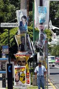 Según Sara Figueroa, presidenta de la Comisión de Preservación del Medio Ambiente y Protección Ecológica de la Asamblea Legislativa, las precampañas y campañas políticas fueron el motivo para que todos los candidatos a puestos de elección popular colgaran o pegaran miles de mantas, pendones, gallardetes, carteles y demás materiales en postes de alumbrado público, semáforos, puentes peatonales, teléfonos, macetones, e incluso árboles.