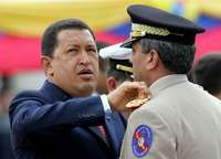 El presidente de Venezuela, Hugo Chávez, coloca su nuevo galón a Raúl Baduel, quien fue designado por el mandatario general en jefe de la armada