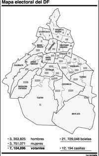 Por delegaciones, el PRD gobierna Alvaro Obregón, Azcapotzalco, Cuajimalpa, Cuauhtémoc, Coyoacán, Gustavo A. Madero, Iztacalco, Iztapalapa, Magdalena Contreras, Tlalpan, Tláhuac, Xochimilco y Venustiano Carranza. El PAN, Benito Juárez y Miguel Hidalgo, y el PRI Milpa Alta.