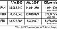 El Peje pintó su rayita: no reconoce la validez de los resultados del PREP; hay indicios de manipulación. La única fuente confiable son las actas de la votación debidamente escrutadas, contadas voto a voto. ¿Alguien tiene una explicación lógica a este par de preguntas? Felipillo sacó -de acuerdo con sus propias cifras- casi 2 millones menos de votos que Fox (en la elección del año 2000); por su parte, López Obrador superó en más de 7 millones los sufragios que recibió el ingeniero Cárdenas. ¿Cómo es que Felipillo aventaja al Peje? ¿Se confió Hildebrando en la mala memoria de los mexicanos? La suma de los votos que perdió el PAN y los que ganó el PRD -de nuevo en relación con la elección de 2000- supera la cifra de 9 millones de votos. ¿No es raro que el presunto triunfador sea Felipillo? Y otra pregunta: si la gente vive tan feliz en foxilandia, ¿cómo es que casi dos millones de ciudadanos castigaron al PAN retirándole su voto? Que alguien nos explique. El cuadro que aparece en esta página está basado en datos del IFE.