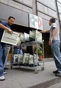 Empleados de una empresa que renta equipo de cómputo retiran las máquinas que habían sido instaladas en la sala de usos múltiples del PRI por los comicios
