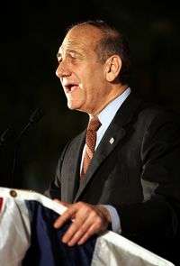 Ehud Olmert, primer ministro israelí, participa en la celebración de la independencia de Estados Unidos en la residencia del embajador estadunidense, Richard H. Jones