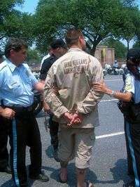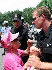 La pacifista Chloe Jon-Pau, de 71 años, quien se manifestaba en Washington contra la guerra en Irak, es confrontada por un oficial de la policía durante los festejos por la independencia de Estados Unidos. A la derecha, un miembro de la organización Veteranos contra la Guerra es detenido por agentes en la misma ceremonia realizada en la capital estadunidense