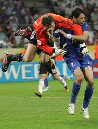 Valiente salida del portero Jens Lehmann, quien por la inercia de la jugada golpeó a Simone Perrotta