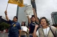 Con la certeza de que ''se está cocinando un fraude electoral de Estado'', integrantes del Frente Universitario de Apoyo Crítico a Andrés Manuel López Obrador realizaron una protesta frente al Angel de la Independencia, en la que llamaron a la ciudadanía a portar un moño tricolor en ''defensa del triunfo presidencial de AMLO''. Con pancartas y mantas en las que se leía ''¡AMLO ganó!'' ''¡Cárcel a Ugalde!'' y ''Respeto al voto'', los manifestantes instaron a los automovilistas a hacer sonar el claxon en señal de protesta.