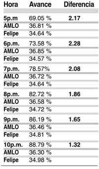 El siguiente cuadro muestra la forma en que fue desarrollándose el conteo de sufragios emitidos en los 300 distritos electorales del país.