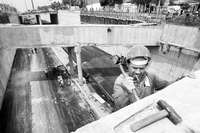 Trabajadores de la construcción durante las obras del Eje 5 Poniente Alta Tensión