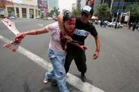 Representación de las agresiones policiacas en Atenco, realizada por jóvenes adherentes a la otra campaña frente a la sede de la ONU en México, el pasado 19 de junio