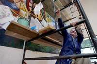 Dos aspectos de La comunicación postal, mural que el maestro Jesús Alvarez Amaya (quien aparece sobre estas líneas) terminó hace unos días en la biblioteca pública Vicente Guerrero, en la Alameda del Sur