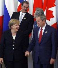 El presidente de Estados Unidos, George W. Bush, junto la canciller federal alemana, Angela Merkel. Atrás, el presidente de México, Vicente Fox Quesada, dialoga con el primer ministro japonés, Junichiro Koizumi, luego de la cumbre del Grupo de los Ocho, en San Petersburgo, Rusia