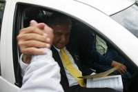 Andrés Manuel López Obrador recibe muestras de simpatía al salir de su casa de campaña