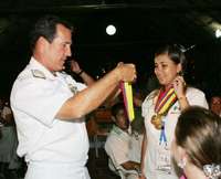 El almirante Gabriel Arango, presidente del comité organizador de los JCC, repuso las medallas a la arquera Linda Ochoa