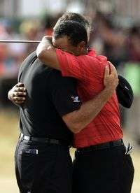 Tiger Woods (derecha) festeja su triunfo con su caddy, el neozelandés Steve Williams