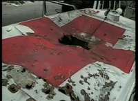 En imagen tomada de video, el toldo de una ambulancia libanesa alcanzada ayer por el fuego israelí en el sur de Líbano y que dejó seis socorristas heridos