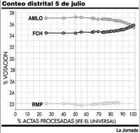 Dos gráficas distintas y una sola sospecha verdadera. La primera, muy conocida, muestra el comportamiento atípico del conteo realizado a partir de datos provenientes de los distritos electorales de todo el país. La segunda se elaboró tomando en cuenta la hora de llegada de los datos al sistema de cómputo distrital, y reporta un comportamiento distinto (Calderón va arriba y AMLO abajo), un desenlace previsto. Es notable el desarrollo simétrico, sobre todo en la segunda gráfica, como si un espejo reprodujera en un contendiente lo que sucedía al otro. (Gráficas elaboradas por el doctor Jaime Ruiz García)