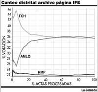 Por otro lado, Víctor Romero Rochín, uno de los diez académicos de la UNAM que han hecho análisis estadístico del PREP y el conteo distrital, califica de "sorprendentes" las coincidencias entre los dos conteos -el preliminar (PREP) y el definitivo (distrital)-: "las curvas de PAN y PRD son, de nuevo, muy atípicas, pues NUNCA (mayúsculas en el original) se estabilizaron, ni siquiera en el último 0.01 de las casillas. Los cruces son esperados al principio de un conteo, pero no en las partes finales. El efecto de 'espejo' es una consecuencia de que los demás participantes se estabilizaron muy bien desde el principio. Por lo tanto, votos que 'pierde' el PRD los 'gana' el PAN, y lo sorprendente es que casi no hay 'viceversa', es decir, el PRD no ganó votos y el PAN no perdió votos... la explicación (...) es que los votos llegaron ORDENADOS de menor a mayor para el PAN y de mayor a menor para el PRD". Adjudicar ese aparente orden prestablecido a que "las casillas que favorecían al PAN se retrasaron en su envío" es un argumento insuficiente, pues requeriría "además, de la misma sincronización casi perfecta (...) para hacerlos llegar en ORDEN".
